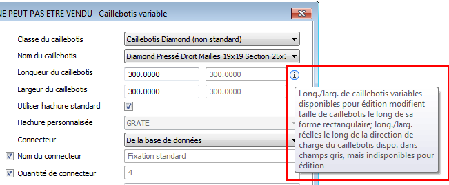 Remarque : Dans la boîte de dialogue Caillebotis variable, si vous passez le pointeur de la souris sur le point d'exclamation sur le côté droit du champ grisé Longueur du caillebotis, une info-bulle s'affiche. L'info-bulle fournit des explications sur l'existence de deux champs Longueur/Largeur.