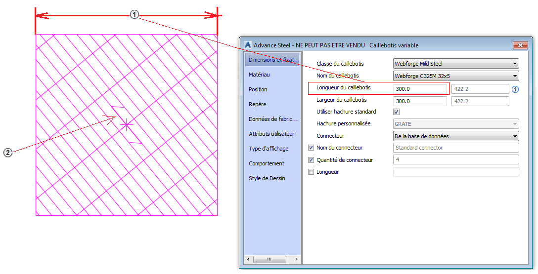 | Hachures personnalisées | Répertorie toutes les hachures disponibles. Vous pouvez sélectionner les hachures pour représenter la face supérieure du caillebotis. |