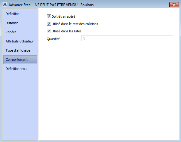 Cet onglet de la boîte de dialogue Propriétés vous permet de sélectionner le comportement du boulon lors de la vérification de collision et du repérage.