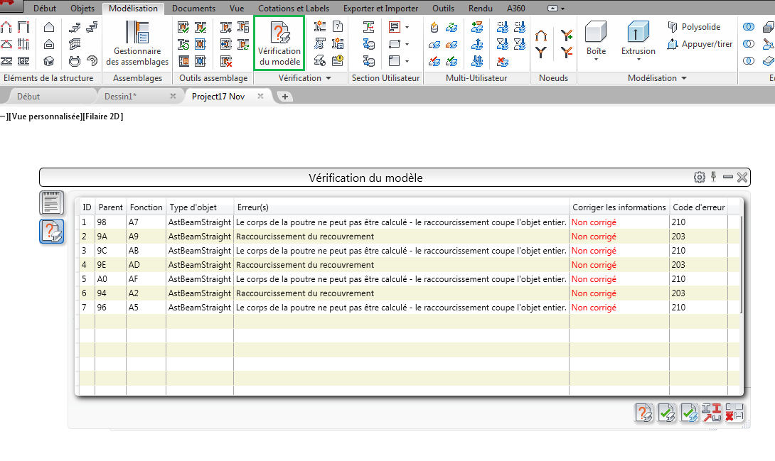 Cette commande effectue des vérifications à la recherche des erreurs de modélisation pour un modèle Advance Steel.