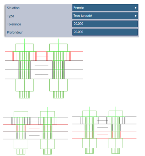 Cette option définit l'élément sur lequel le type de trou configuré spécifique sera créé, lorsque les boulons traversent plusieurs éléments. Si vous sélectionnez Premier/Dernier, le type de trou défini ici sera créé uniquement sur le premier/dernier élément traversé par les boulons. Par défaut, les trous ronds seront créés au travers des autres éléments. Si vous sélectionnez Tout, le type de trou configuré spécifique sera créé sur tous les éléments. ![]() |