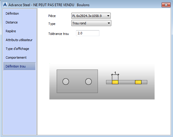 | Type | Sélectionnez le type de trou pour l'élément sélectionné. La boîte de dialogue affiche les paramètres du type de perçage sélectionné. |