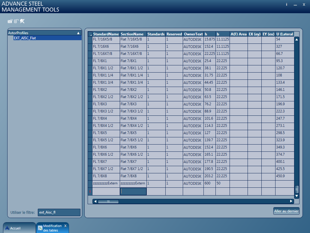 Pour ajouter une taille à une forme existante, vous devez modifier la base de données AstorProfiles à l'aide de l'Editeur de table de l'application Management Tools ou tout autre éditeur .mdf (SQL Server par exemple). La base de données AstorProfiles est située par défaut à l'emplacement ...\ProgramData\Autodesk\Advance Steel 2023\[EXTENSION LANGUE D'INSTALLATION]\Steel\Data