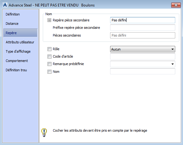| Rôle | Attribue le rôle dans le modèle. Il est par exemple pris en compte lors de la création de dessin afin d'attribuer une présentation, une cotation et un style de label. |
