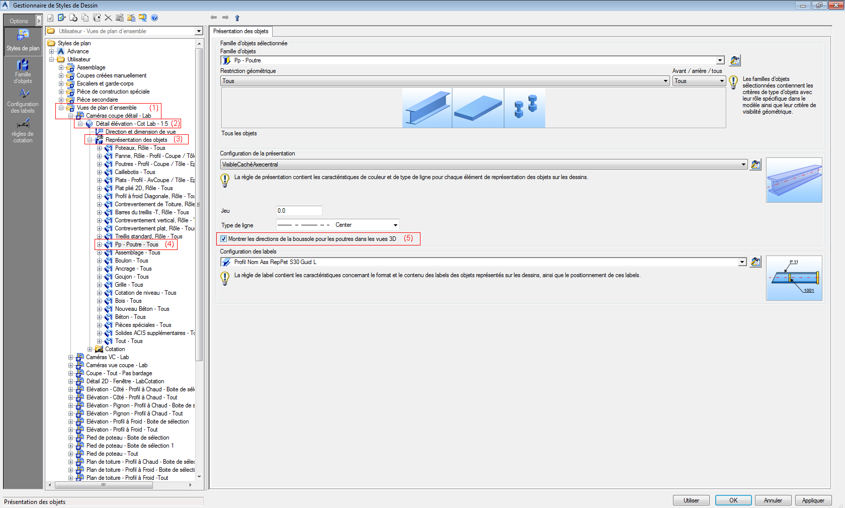 - Dans la partie droite de la boîte de dialogue (onglet Représentation de l'objet), cochez la case Afficher boussole. pour les poutres dans les vues 3D (5).