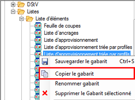 Sélectionnez un gabarit existant, copiez-le et renommez-le (dans cet exemple, une copie de la Liste d'approvisionnement triée par profils est renommée Copie deListe d'approvisionnement triée par profils).
