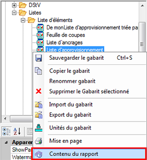 - Par exemple, cliquez avec le bouton droit sur la liste des matériaux et sélectionnez le contenu du rapport dans le menu contextuel.