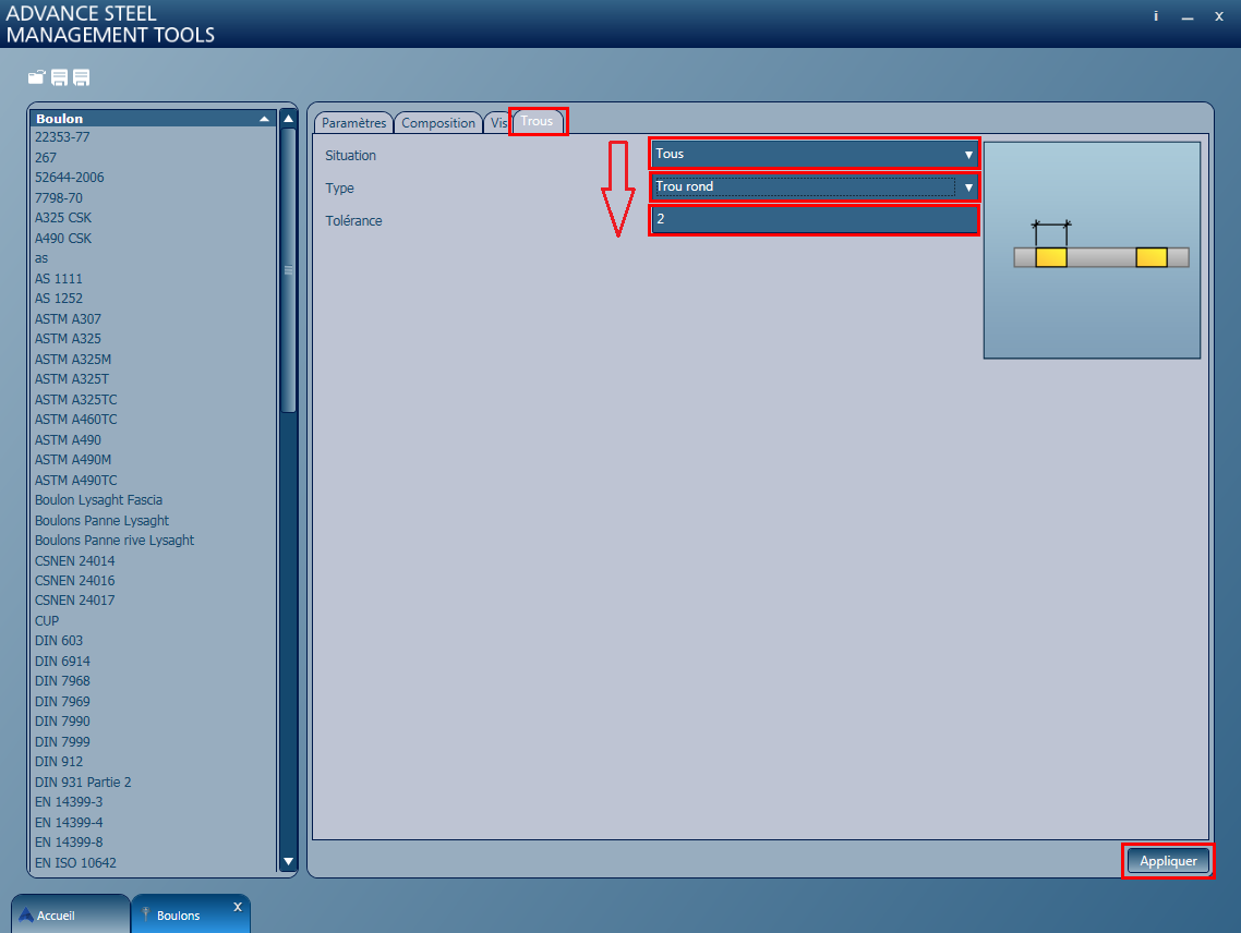 Par exemple, sélectionnez 8,8 pour la classe et 27,00 pour le diamètre.
