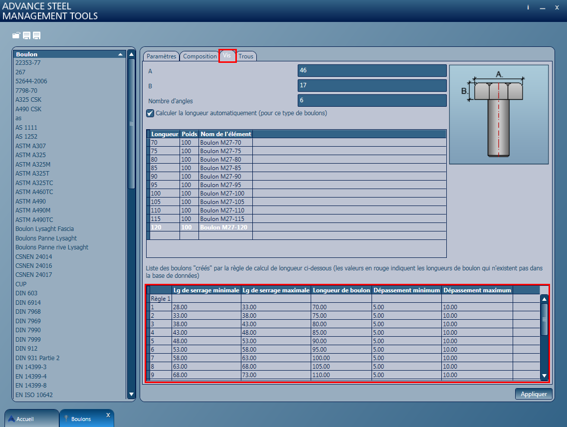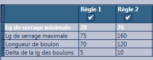 Désormais, lorsque vous revenez à l'onglet Boulons, vous constaterez que la deuxième table a été mise à jour automatiquement, avec des longueurs de boulons et des longueurs de poignée, après avoir défini les règles (Règle 1 et Règle 2).