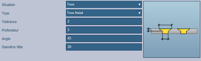 - Trous fraisés : deux autres paramètres doivent être définis pour ces trous, à savoir l'angle et le diamètre de la tête.
