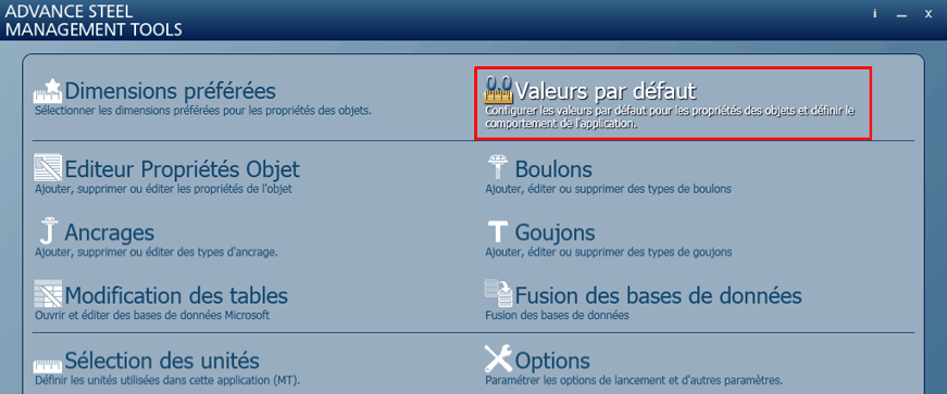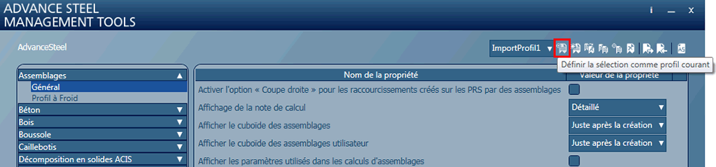Le nouveau profil importé peut être défini comme profil actif à l'aide de la commande Définir la sélection comme profil courant. Après l'ouverture d'Advance Steel, tous les paramètres par défaut sont disponibles.