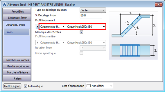 Créez un assemblage Escalier dans Advance Steel et dans les propriétés, choisissez la coupe utilisateur précédemment définie.