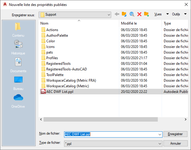 Cette procédure permet de créer une liste des propriétés publiées (PPL) répertoriant les définitions de jeux de propriétés du fichier DWG qui seront exportées au format DWF ou DWFx, excepté celles qui ont été ajoutées à des objets ou à des styles du dessin.