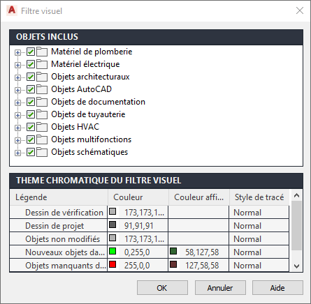 Sélectionnez les objets à comparer sous Objets inclus. Par exemple, vous pouvez définir un filtre visuel afin de comparer uniquement les fenêtres modifiées. Tous les autres objets s'affichent comme étant inchangés. Sous Thème chromatique du filtre visuel, vous pouvez modifier les couleurs et affecter des styles de tracé à différents groupes d'objets, à toutes les fenêtres modifiées par exemple. La colonne Couleur répertorie les couleurs des objets en attente avant la sélection de ces derniers. La colonne Couleur affichée répertorie les couleurs des objets après la sélection de ces derniers.