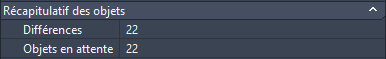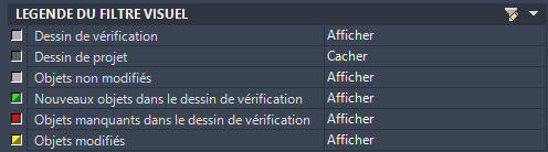 L'onglet Vérification de la palette de comparaison des dessins permet de vérifier les résultats d'une session de comparaison des dessins objet par objet. Il fournit également une option de filtrage de la zone de dessin qui permet de masquer certaines catégories d'objets, voire un dessin entier. Cet onglet inclut les sections suivantes :