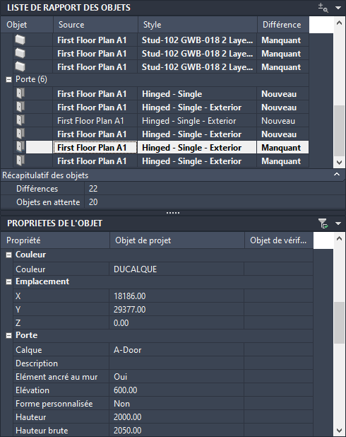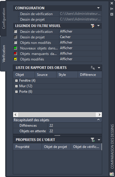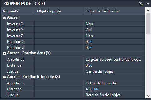Si l'objet est manquant, les données ne sont répertoriées que dans la colonne Objet de projet. S'il s'agit d'un nouvel objet, les données ne sont répertoriées que dans la colonne Objet de vérification. Les propriétés du dessin de projet et celles du dessin de vérification s'affichent pour les objets modifiés.