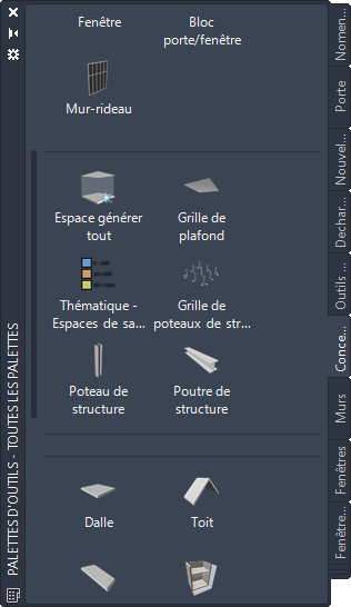 Les palettes personnalisées créées par votre gestionnaire CAO ou d'autres utilisateurs peuvent également contenir des outils de trames de faux-plafond, ainsi que des propriétés de trames de faux-plafond personnalisées en fonction de vos projets ou de vos normes professionnelles.