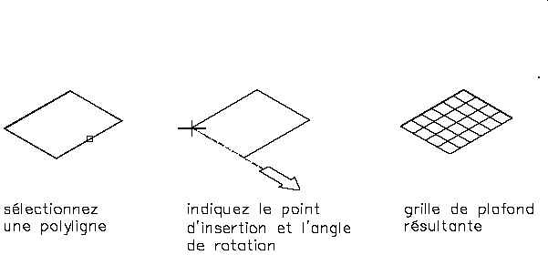 Cette procédure permet de créer une trame de faux-plafond dans une polyligne fermée ou un objet espace. Dans ce deuxième cas, la grille est automatiquement créée à hauteur du plafond de l'espace.