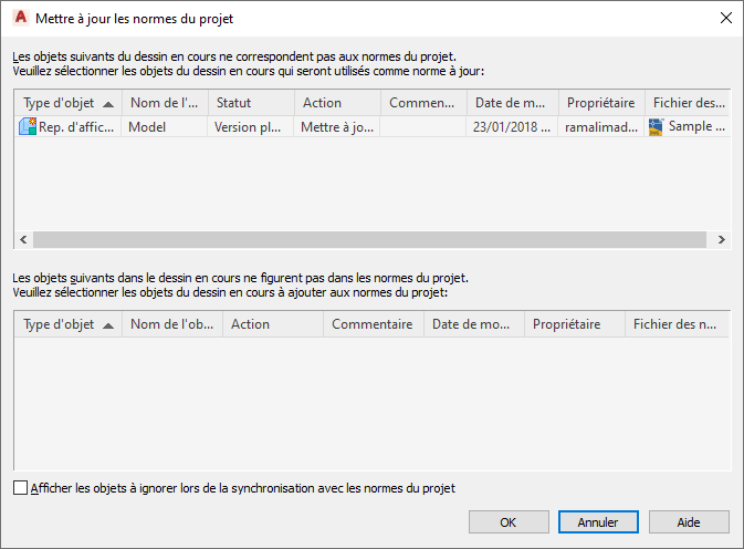 Dans ce cas, l'élément ne s'affichera pas dans les futures mises à jour, sauf si, pendant la synchronisation des normes du projet, vous sélectionnez l'option Afficher les objets à ignorer lors de la synchronisation ou si vous désactivez le marqueur Ignorer du paramètre d'affichage du Gestionnaire d'affichage.