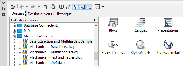 L'arborescence de la partie gauche de la fenêtre DesignCenter et les onglets DesignCenter permettent de rechercher un contenu et de le charger dans la zone de contenu.