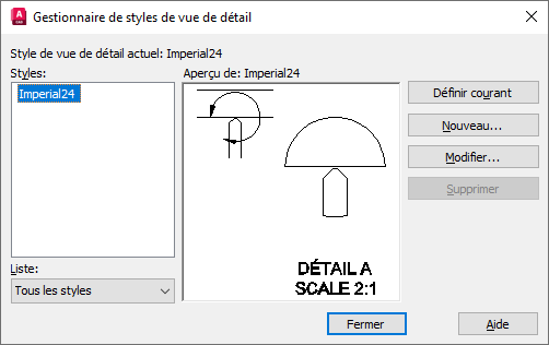 Affiche une liste des styles de vue de détail disponibles dans le fichier de dessin actuel. Le style courant est en surbrillance.