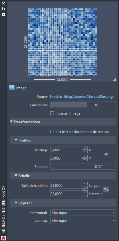 Les paramètres de texture contrôlent de nombreux aspects des textures appliquées aux matériaux, y compris la position, l'échelle, la taille et la répétition. Certains paramètres sont communs à plusieurs textures. D'autres sont spécifiques à un type de texture.