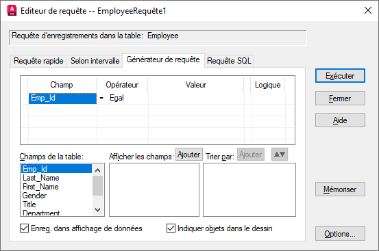 Affiche la liste des champs disponibles à partir de la table de base de données courante, dans laquelle vous pouvez choisir les champs à afficher dans la fenêtre Affichage des données lors de l'exécution de la requête. Si vous ne désignez pas les champs à afficher, la requête renvoie tous les champs de la table de base de données. Si vous cliquez deux fois sur un champ de cette liste ou sélectionner un champ, puis sur Ajouter (afficher les champs), vous ajoutez le champ à ceux affichés dans la fenêtre Affichage des données une fois la requête exécutée. Vous pouvez aussi faire glisser des champs dans les zones Afficher les champs et Trier par.
