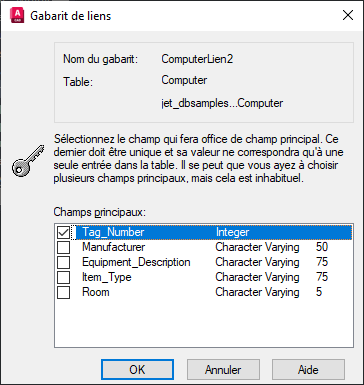 Affiche tous les champs disponibles pour la table de base de données courante, ainsi que le type de champ et, pour les champs de caractères, la longueur de champ. Pour spécifier les champs clés du gabarit de liens, sélectionnez la case à cocher située à gauche du nom de champ.