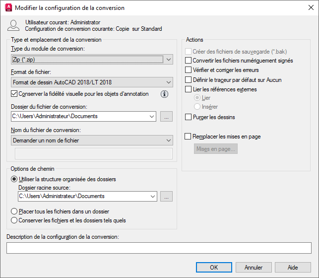 Entrez une description pour la configuration de conversion. Cette description s'affiche dans les boîtes de dialogue Conversion DWG et Configurations de conversion, sous la liste des configurations de fichier de conversion. Vous pouvez sélectionner, dans la liste, la configuration de conversion de votre choix pour en afficher la description.