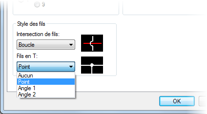 Lorsqu'un fil se termine au niveau d'un autre fil et forme une connexion en T, un point ou un angle en T est inséré, tel que défini dans l'onglet Styles de la boîte de dialogue Propriétés du dessin.