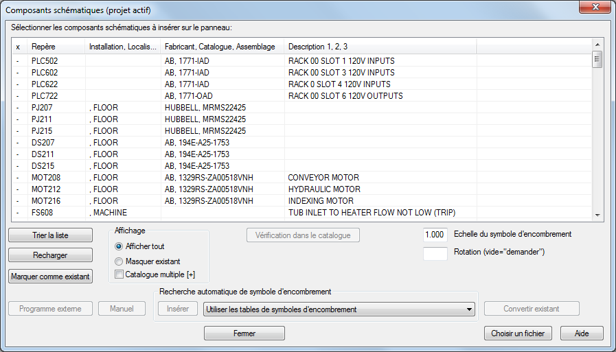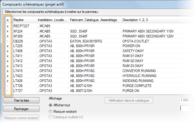 La boîte de dialogue indique les composants schématiques ayant déjà été insérés dans une présentation de panneau.