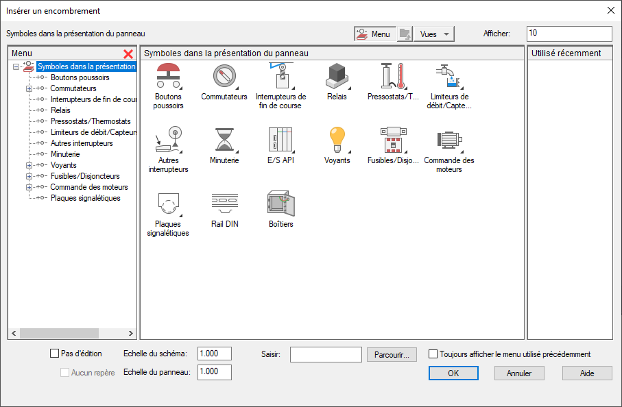 Pour les composants de panneau qui n'apparaissent pas dans le schéma, utilisez le menu d'icônes de panneau pour insérer des encombrements de panneau. Trouver