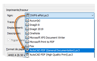 Dans la liste déroulante Imprimante/traceur, choisissez PDF AutoCAD (documentation générale).pc3 :
