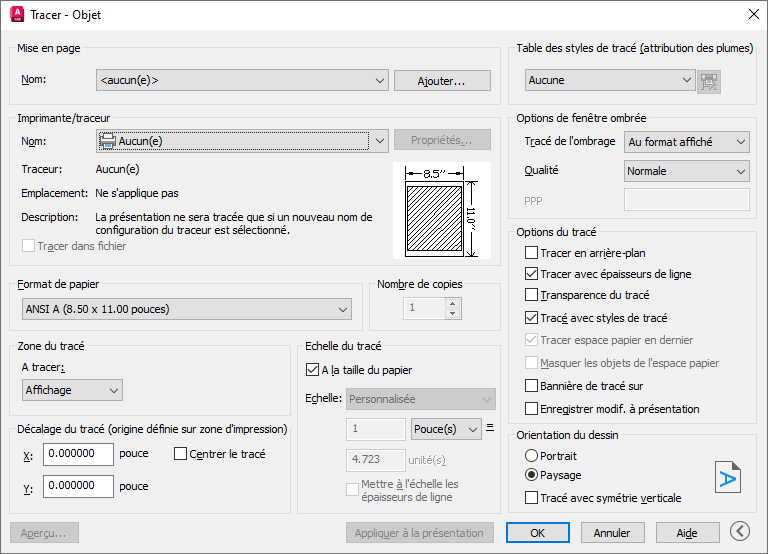 Effectuez la sortie d'une présentation de dessin sur un traceur, une imprimante ou dans un fichier. Enregistrez et restaurez les paramètres de l'imprimante pour chaque présentation.
