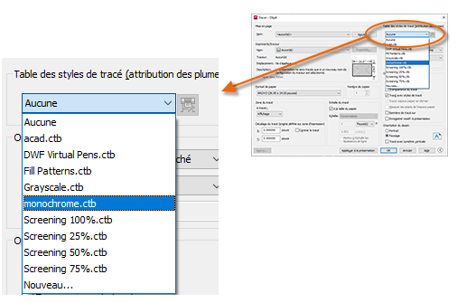 La table des styles de tracé fournit des informations sur le traitement des couleurs. Les couleurs qui offrent un bel effet sur votre écran peuvent ne pas convenir à un fichier PDF ou à l'impression. Vous pouvez par exemple créer un dessin en couleurs, mais aussi une sortie monochrome. La procédure à respecter pour définir une sortie monochrome est la suivante :
