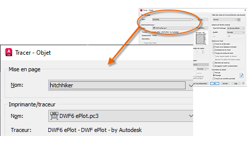 Lorsque vous êtes prêt à effectuer le tracé, il suffit de spécifier le nom de la mise en page dans la boîte de dialogue Tracer pour que tous les paramètres de tracé soient rétablis. Dans l'illustration suivante, la boîte de dialogue Tracer est configurée pour utiliser la mise en page Hitchhiker, ce qui permet de générer un fichier DWF (Design Web Format) au lieu d'effectuer l'impression dans un traceur.