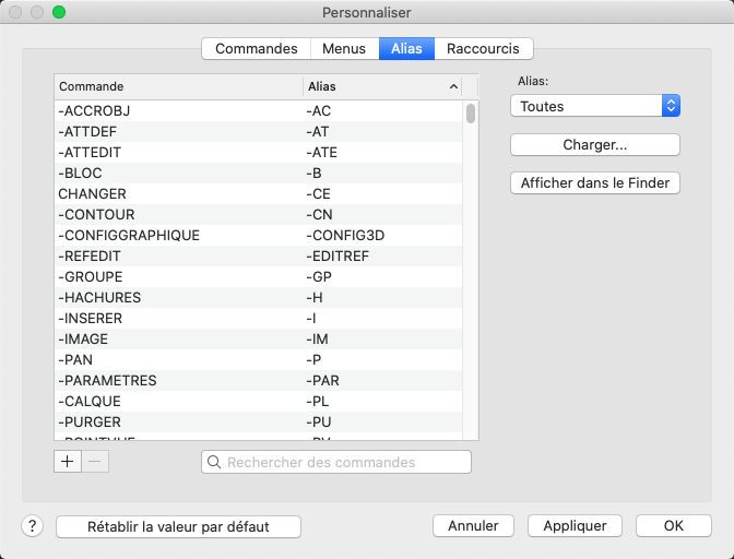 Remarque : Les modifications apportées aux alias de commande sont enregistrées dans le fichier acaduser.pgp (ou acadltuser.pgp pour AutoCAD LT).