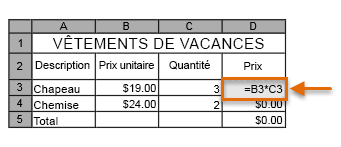 - Dans la première cellule sous Prix (D3), entrez =B3*C3. Les cellules sont automatiquement multipliées.