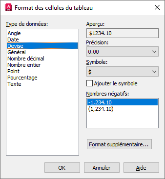 Si vous avez sélectionné le format de données Devise, le symbole $ s'affiche automatiquement. Les entrées $0.00 sont nécessaires en tant qu'espaces réservés pour le format. Si les valeurs des colonnes de devise n'affichent pas le symbole $, cliquez avec le bouton droit et sélectionnez Format de données pour changer le format des données de cellule en Devise.