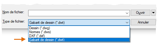 Si vous travaillez de façon indépendante, vous pouvez créer vos fichiers de gabarit de dessin en fonction de vos habitudes de travail. Vous pouvez ajouter les paramètres d'autres fonctions à mesure que vous vous familiarisiez avec elles. Pour modifier un fichier gabarit de dessin existant, cliquez sur Ouvrir, spécifiez le format Drawing Template (*.dwt) dans la boîte de dialogue Sélectionner un fichier, puis sélectionnez le fichier gabarit de dessin.