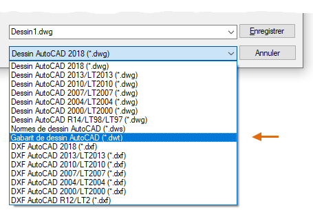 Vous pouvez enregistrer un fichier dessin (.dwg) en tant que fichier de gabarit de dessin (.dwt). Pour créer un fichier gabarit de dessin à partir d'un fichier existant, ouvrez le fichier gabarit de dessin existant, modifiez-le, puis réenregistrez-le sous un autre nom.