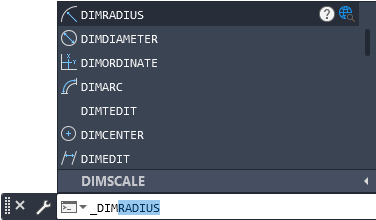 Dès que vous commencez à taper le nom de la variable système ou commande dans la ligne de commande, la fonction de saisie automatique affiche vos choix. Par exemple, si vous entrez dim, toutes les commandes et variables système commençant par ces lettres sont répertoriées comme indiqué.