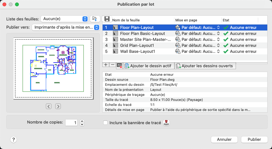 Vous pouvez publier le jeu de dessins dans un fichier PDF, ou l'envoyer vers l'imprimante spécifiée dans la mise en page pour en réaliser une copie papier.