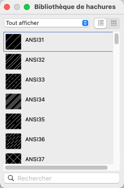 La bibliothèque de hachures peut être affichée sous forme de boîte de dialogue lors de l'utilisation de la boîte de dialogue Hachures et gradient, ou en tant que palette à partir du viseur Hachures ou Gradient.
