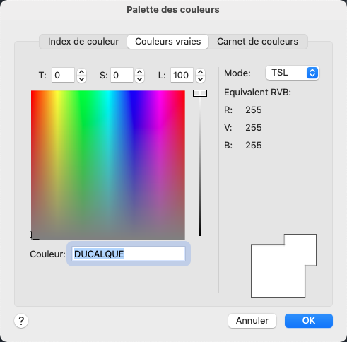 Spécifie le modèle de couleurs RVB pour la sélection des couleurs. Les options disponibles dans l'onglet Couleurs vraies dépendent du modèle de couleurs indiqué : TSL ou RVB.