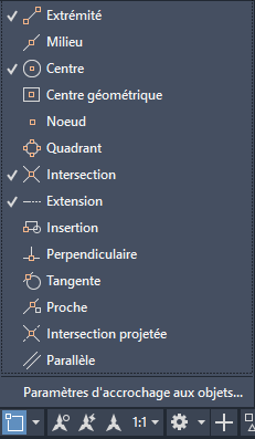 Si vous devez utiliser un ou plusieurs accrochages aux objets consécutivement, activez le mode d'accrochage aux objets, qui reste défini pour toutes les commandes ultérieures. Par exemple, vous pouvez définir Extrémité, Milieu et Centre comme accrochages aux objets actifs.