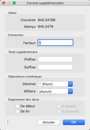 Indique le facteur de conversion à utiliser sur la valeur courante. Le paramètre par défaut est 1 pour aucune conversion.