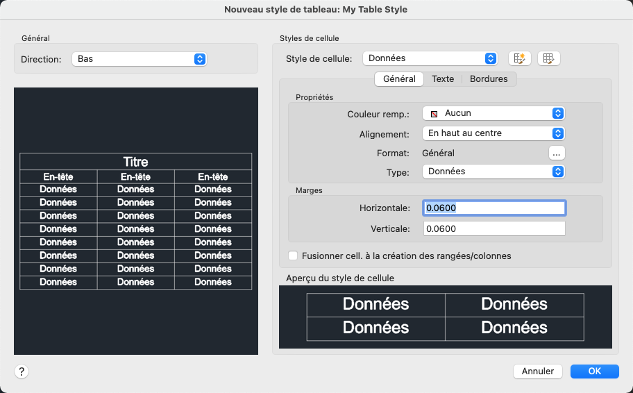 Les styles de tableau existants pour le dessin courant sont répertoriés dans la boîte de dialogue Gestionnaire des styles de tableau.