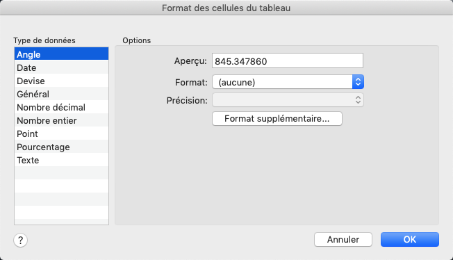 Affiche la liste des types de données (Angle, Date, Nombre décimal, etc.) pouvant être formatés dans les lignes du tableau.