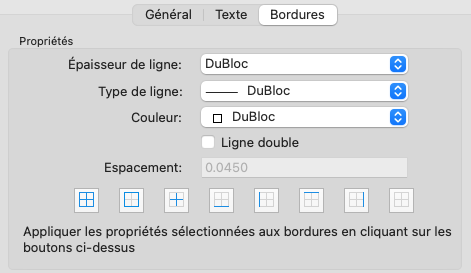 Gère l'aspect des bordures des cellules. Les propriétés de bordure sont l'épaisseur de ligne et la couleur des lignes de grille.